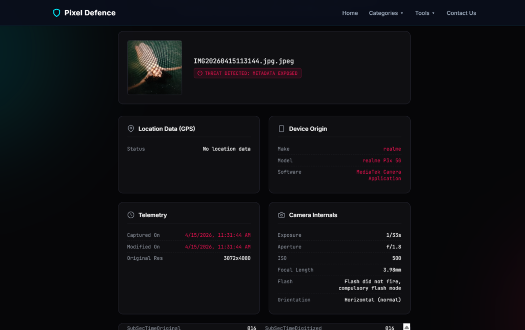 For images where privacy matters, Pixel Defence’s Metadata Scrubber provides a straightforward way to strip that data without sending your original files to a third-party server — everything runs locally in your browser, so the images never leave your device.